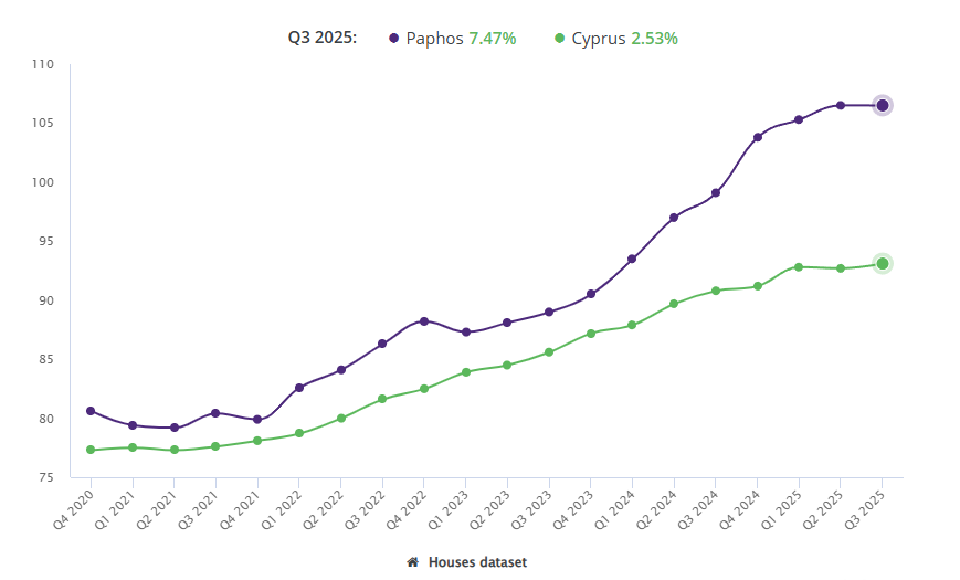 גרפים המייצגים את מחירי הנדל”ן על פני חמש שנים בפאפוס (ובהשוואה לכלל קפריסין) דירות ובתים: